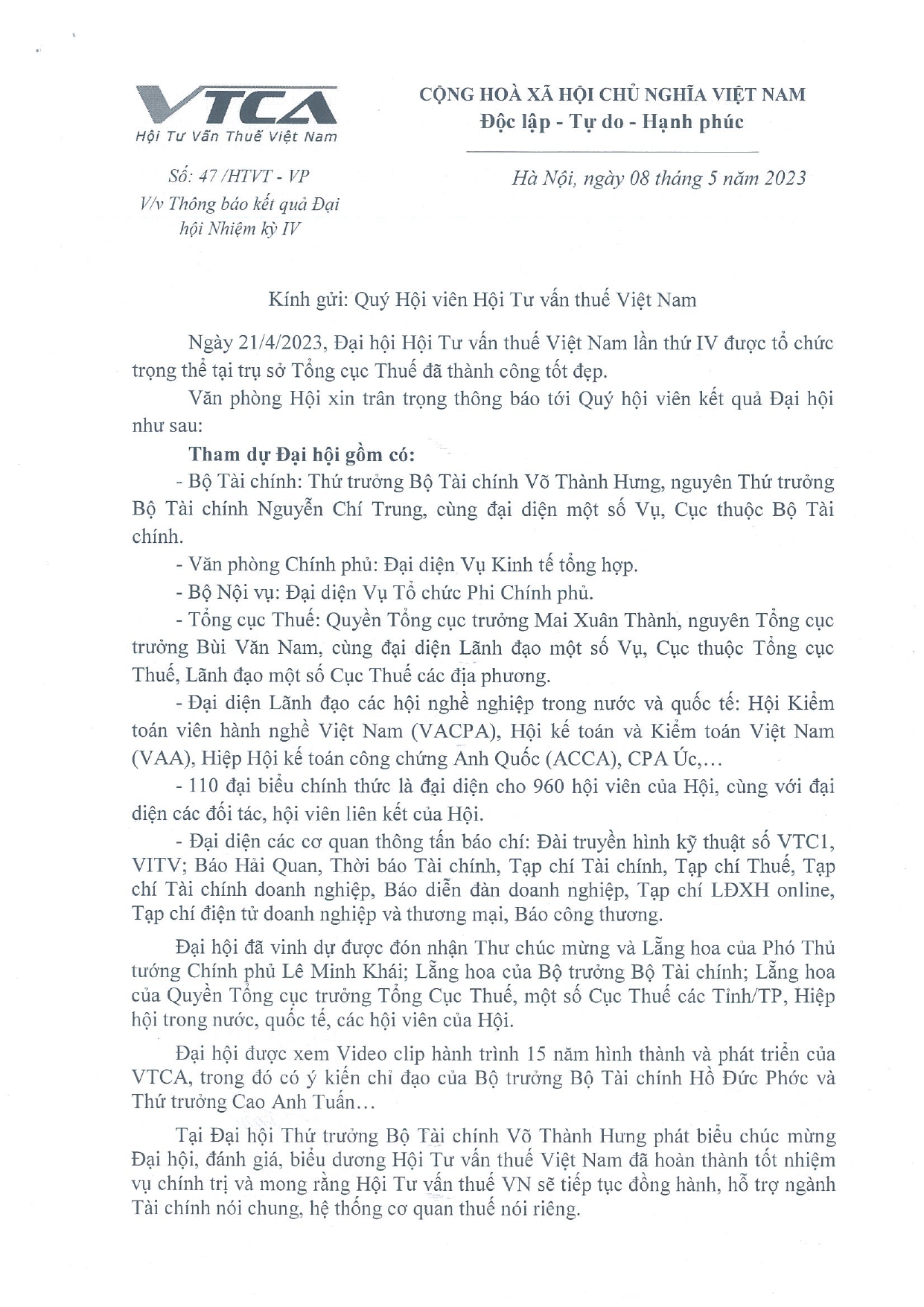 Thông báo kết quả Đại hội NK IV