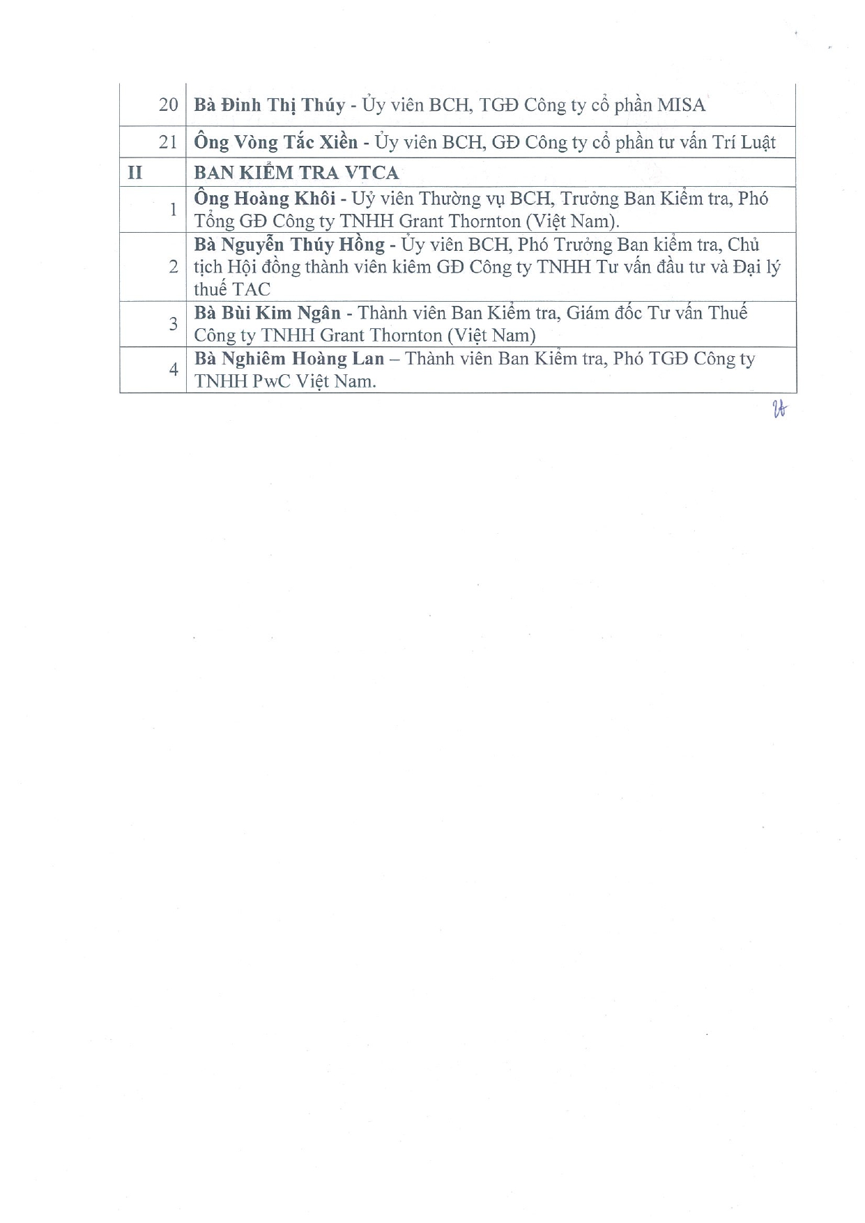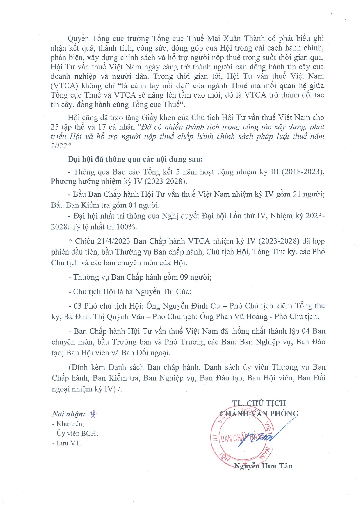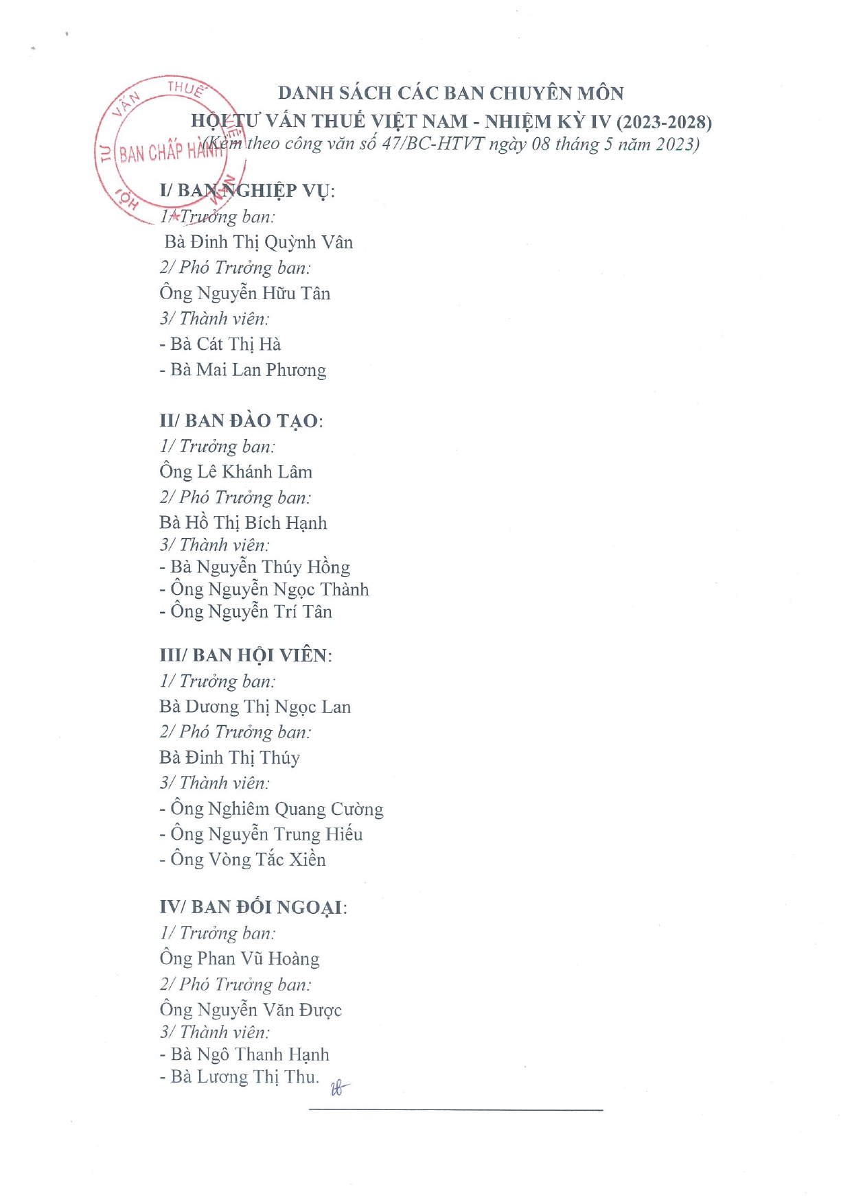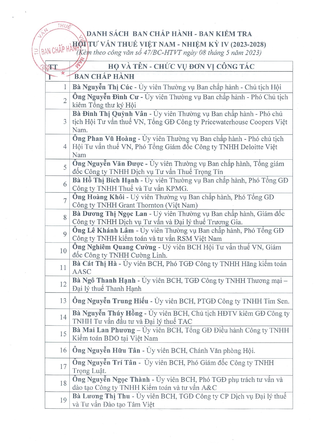 BAN CHẤP HÀNH - BAN KIỂM TRA HỘI TƯ VẤN THUẾ VIỆT NAM - NHIỆM KỲ IV (2023-2028)